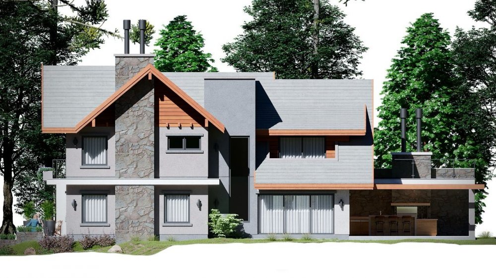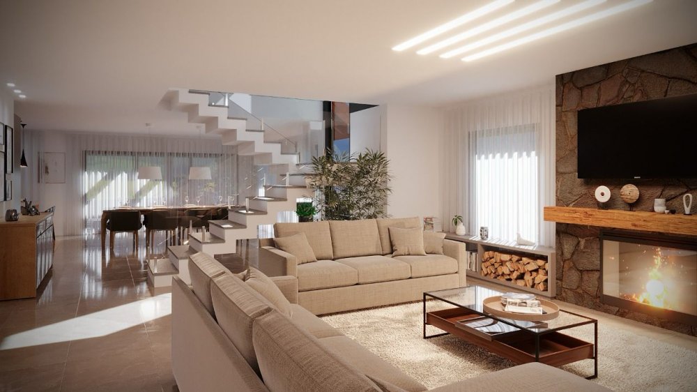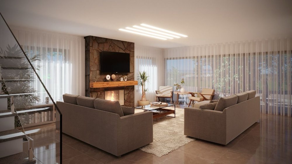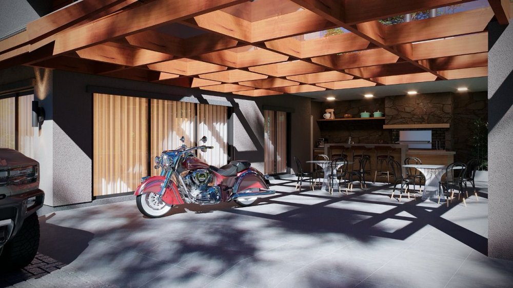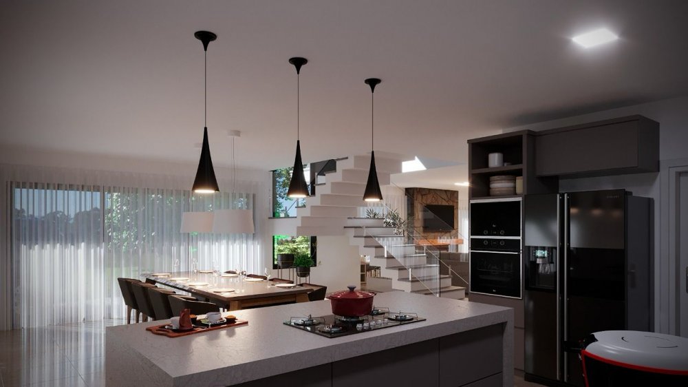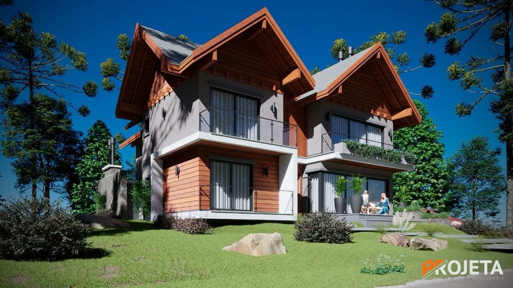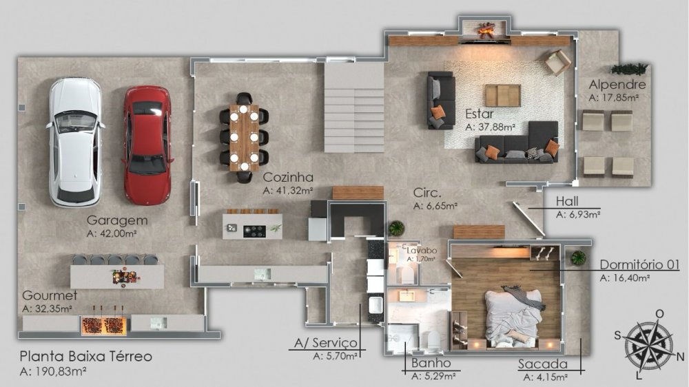 Térreo - Hall de entrada, alpendre, suíte, lavabo, living integrado com espaço gourmet integrado, cozinha, garagem.