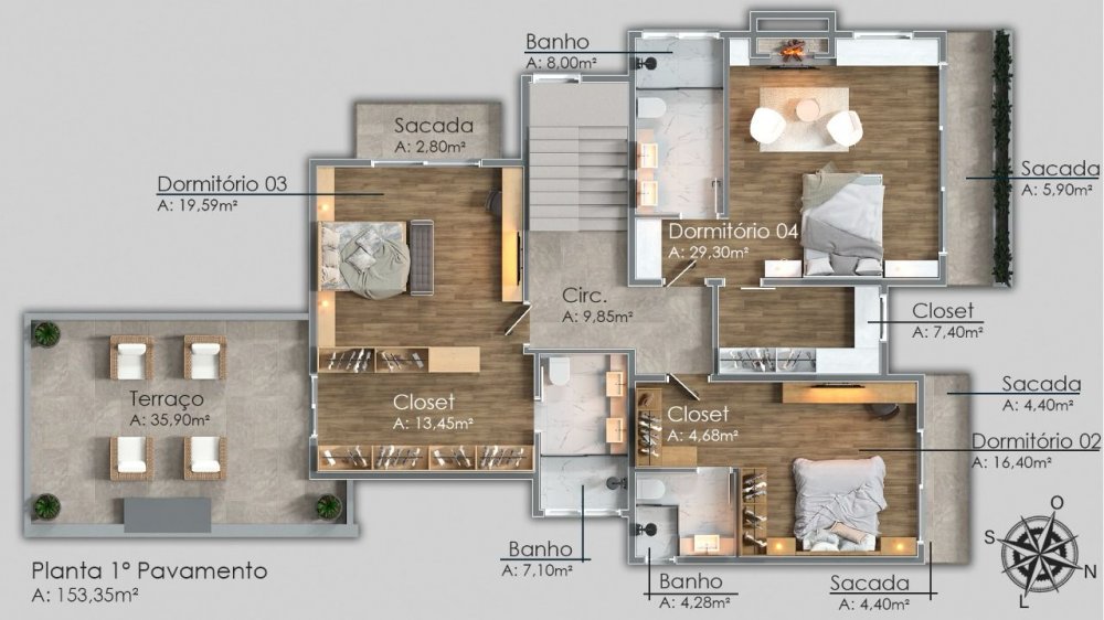 Superior - 3 Suítes, sendo 2 Máster (uma com sacada e terraço)