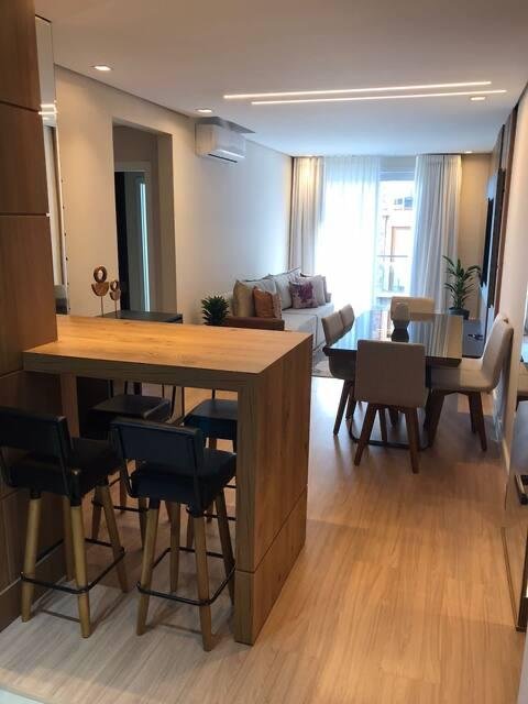Apartamento Mobiliado com 02 suítes,  sala de estar e jantar, cozinha, churrasqueira, lavanderia, lavabo, ar condicionado, sacada, esquadrias em PVC com vidro duplo, garagem.